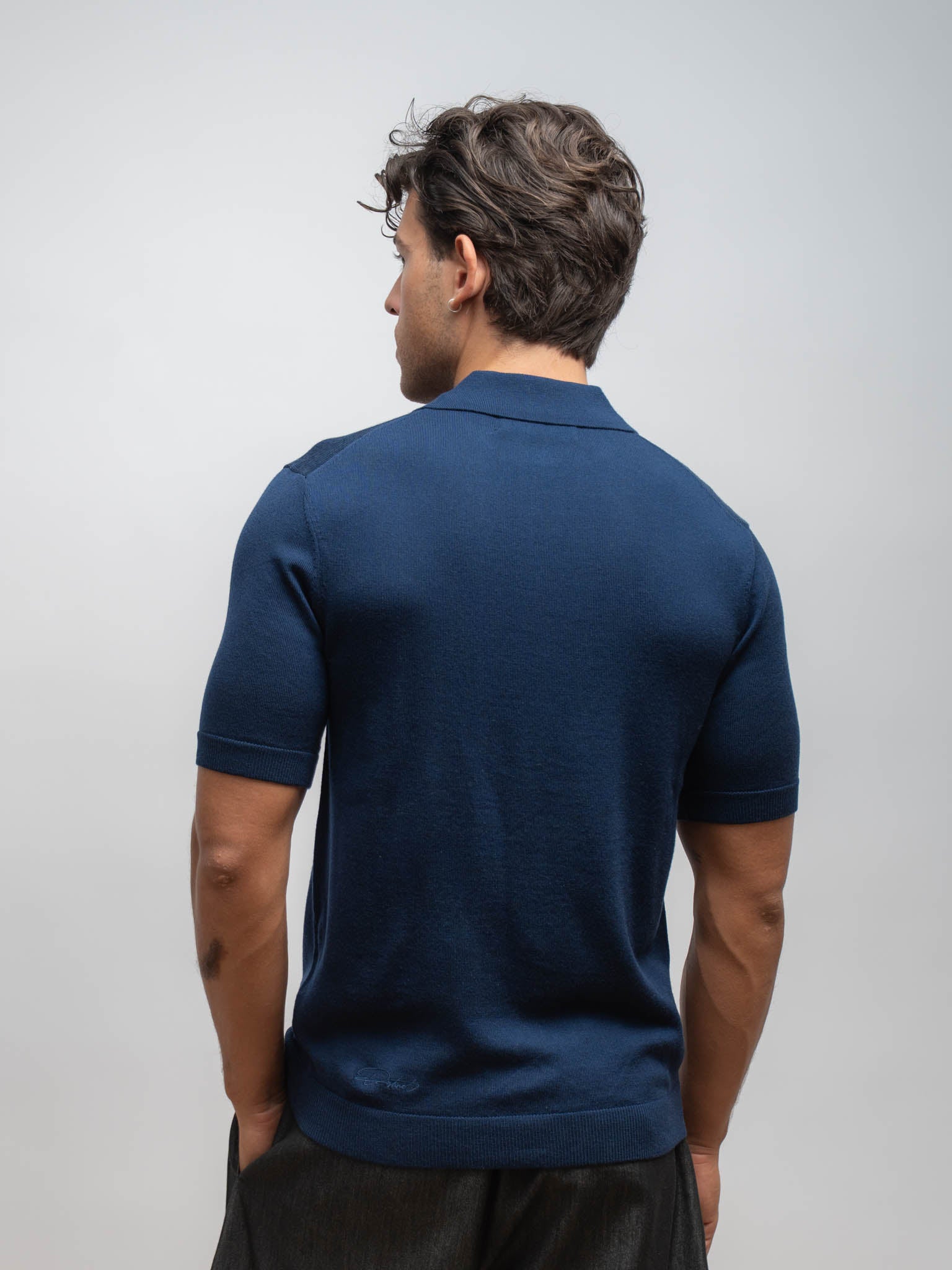Det diskrete Distinct-logo er placeret nederst til venstre på ryggen, tone-i-tone med poloens farve. En bevidst detalje, der understreger helheden uden at tiltrække unødig opmærksomhed.